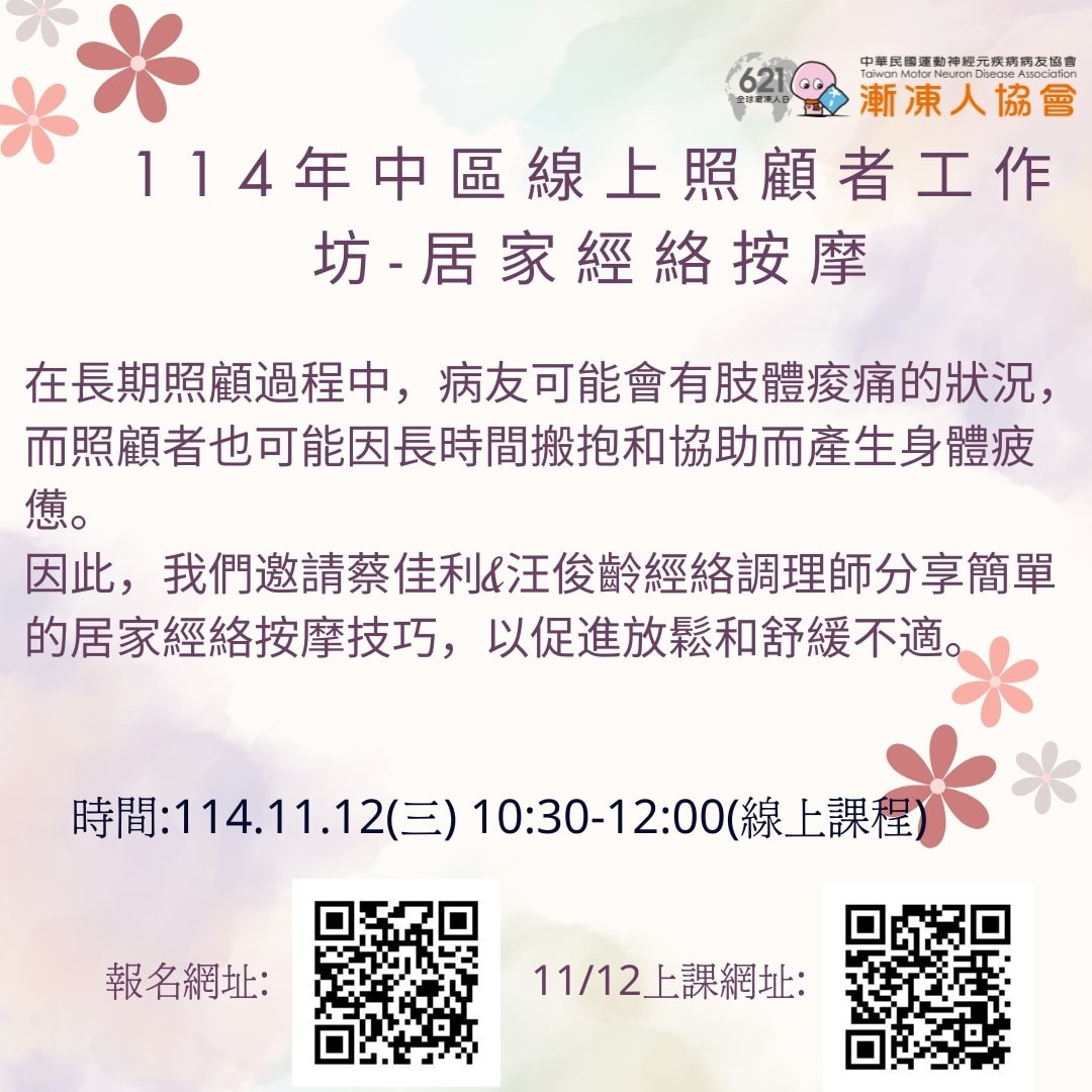11月12日【中區線上照顧者工作坊-居家經絡按摩】活動報名