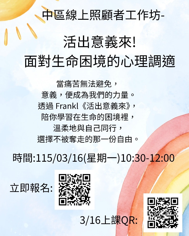 中區線上工作坊|活出意義來:面對生命困境的心理調適